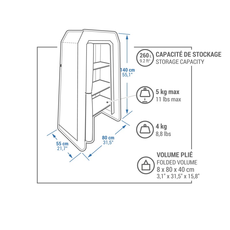 Надувной кемпинговый шкаф Quechua Air Seconds. Может использоваться для хранения, организации и защиты личных вещей и аксессуаров в кемпинге. Шкаф позволяет организовать и защитить ваши личные вещи в кемпинге. Имеется ручка для переноски в сложенном состоянии. Деревянные полки рассчитаны на нагрузку до 5 кг.